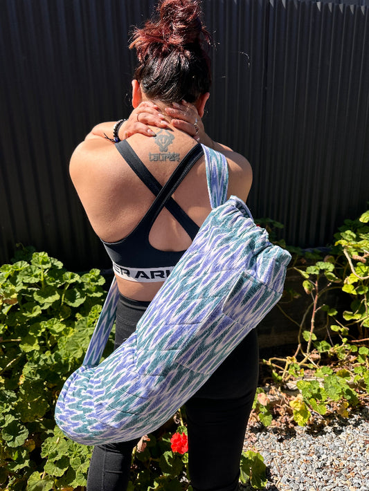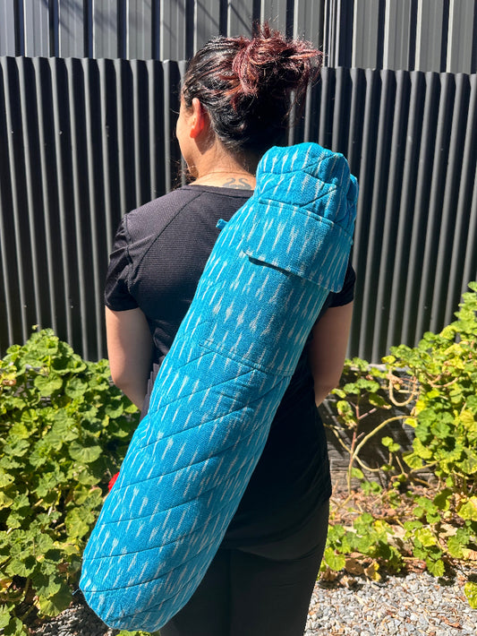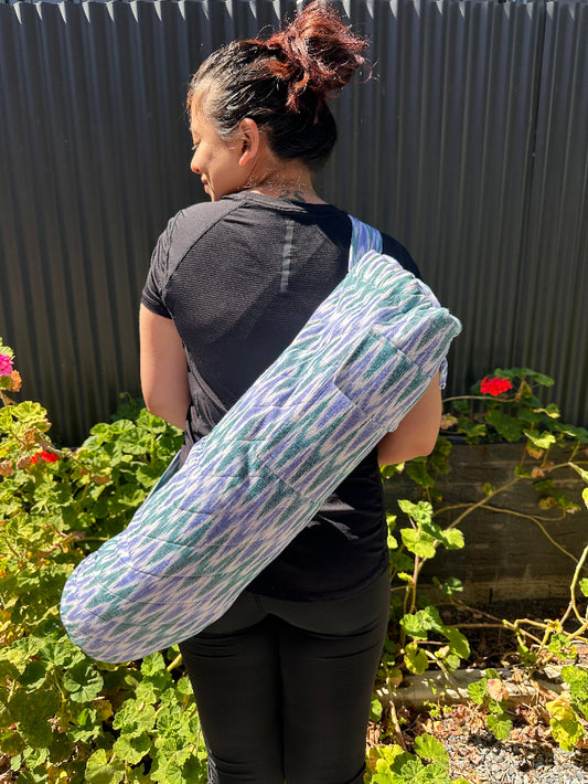 Quilted Yoga/Beach Mat Bag in White & Blue Printed Ikat Cotton