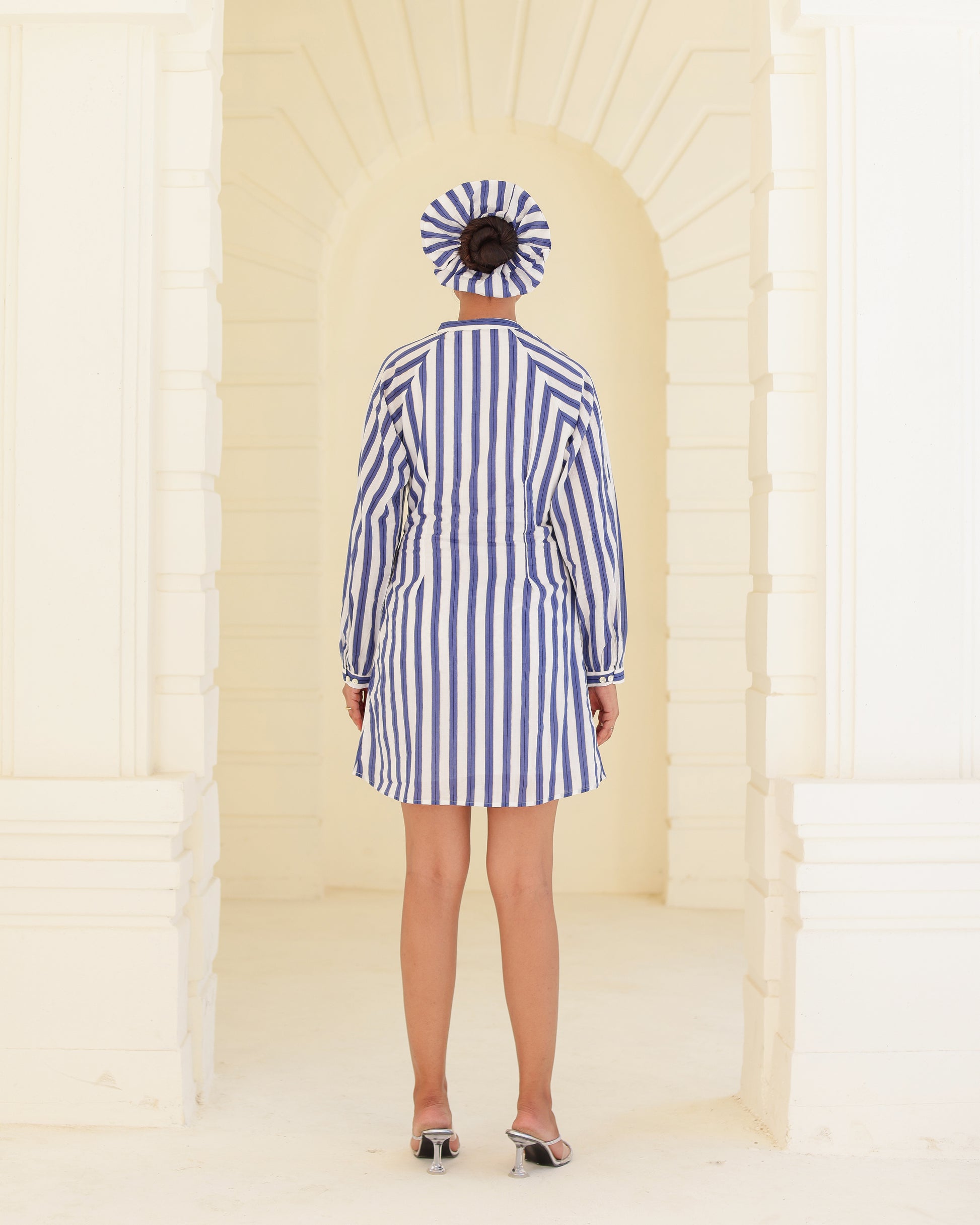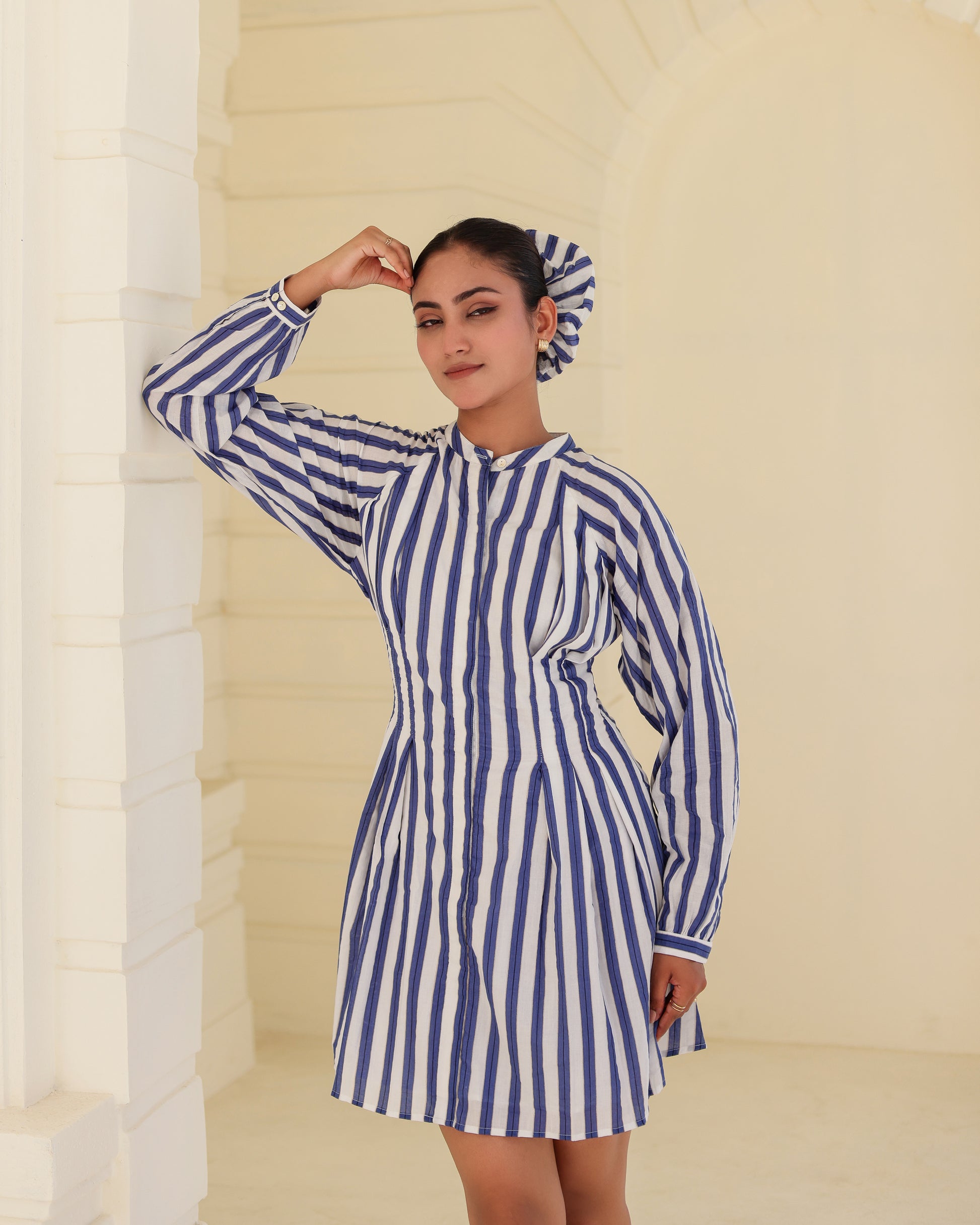 The Azure Stripe Mini Dress is crafted from hand-printed cotton fabric, combining contemporary design with effortless comfort. Featuring a high neckline, statement full sleeves, and a tailored waistline, it creates a flattering and confident silhouette. The vertical stripes in sky blue and white bring a refreshing, youthful energy , making this dress perfect for sunlit afternoons, brunches, or spontaneous getaways.