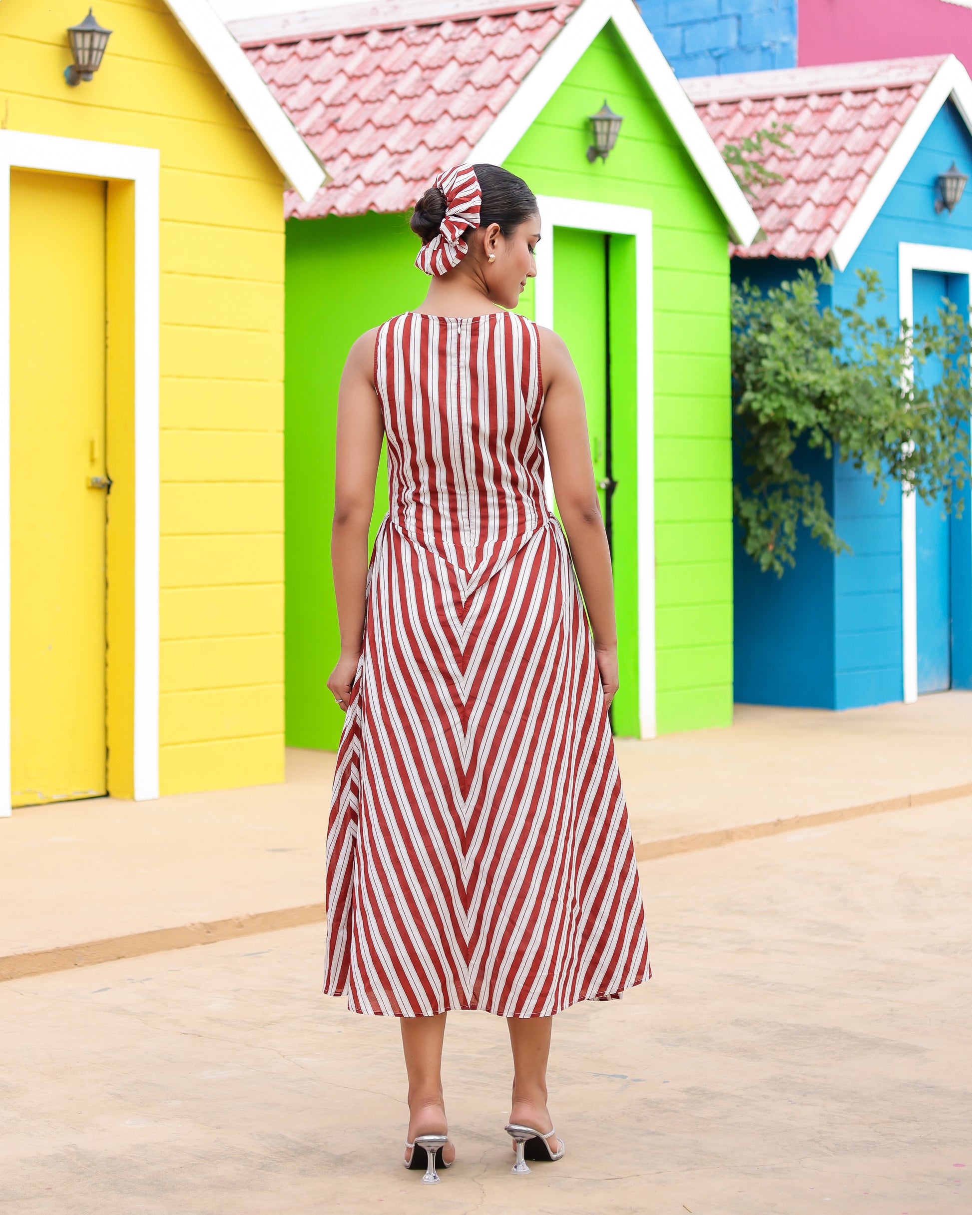 The Hazel stripe Midi Dress is crafted from hand-printed cotton fabric, designed to bring comfort and timeless sophistication to your everyday style. Featuring a refined boat neckline and a graceful A-line silhouette, this piece flows effortlessly while enhancing your natural shape. The rich brick red stripes add warmth and depth, creating a statement that feels both earthy and elegant, perfect for every season.