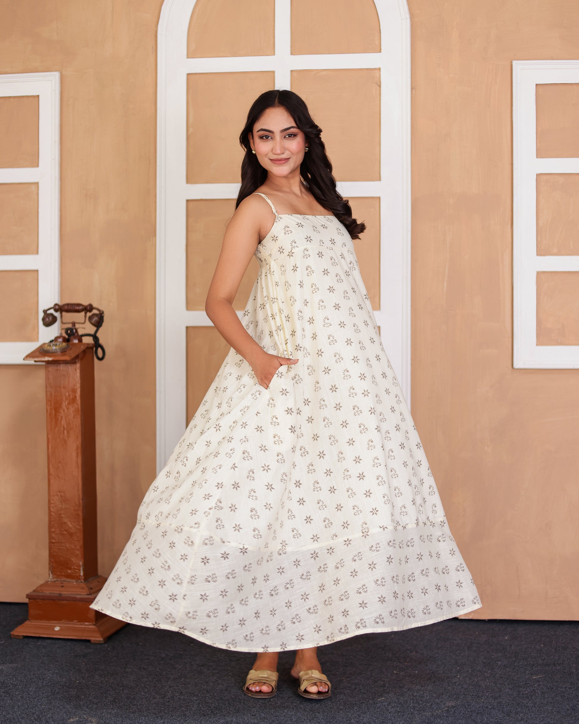 Sirmaur Strappy Maxi Dress- Evoking the regal splendour of floral motifs with exquisite placement, this high-bust design features a stunning in-house print. The rare and unique hand block printing technique is inspired by the vibrant energy of an Indian summer and the timeless beauty of the City Palace, making it a truly one-of-a-kind piece.