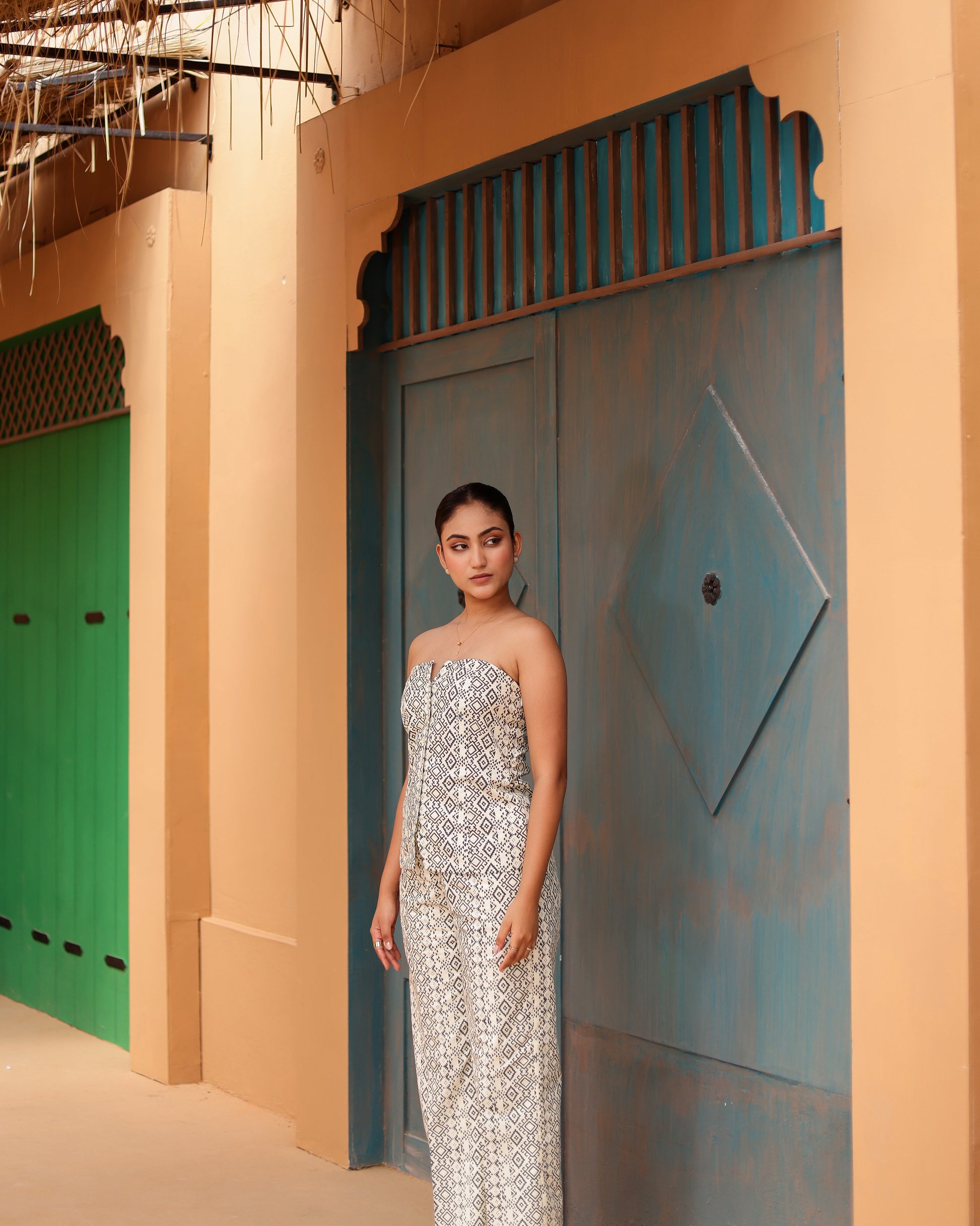 Zia Vest Top and Pant is a true work of art, meticulously crafted with two abstract hand-block printed patterns. Drawing inspiration from my grandmother's era, where black and white were the defining colors of style, Together as a set it is masterpiece of craftsmanship, intricately designed, the pants seamlessly blend vintage charm with contemporary flair, creating a modern, sophisticated look with a nod to the past. A statement piece to add grace to your wardrobe.